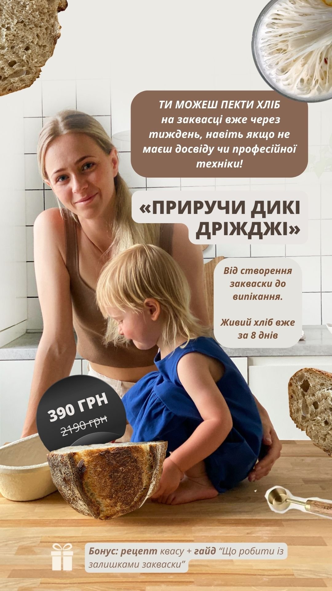 Я створила курс «Приручи дикі дріжджі», щоб довести: натуральний хліб може пекти кожна. Навіть якщо ти ніколи раніше не пекла, навіть якщо лякають слова «закваска» чи «ферментація».